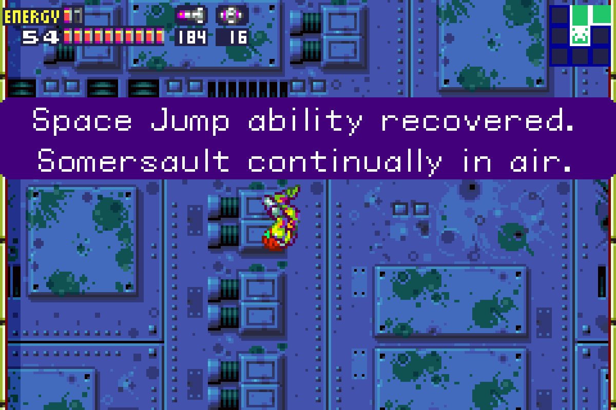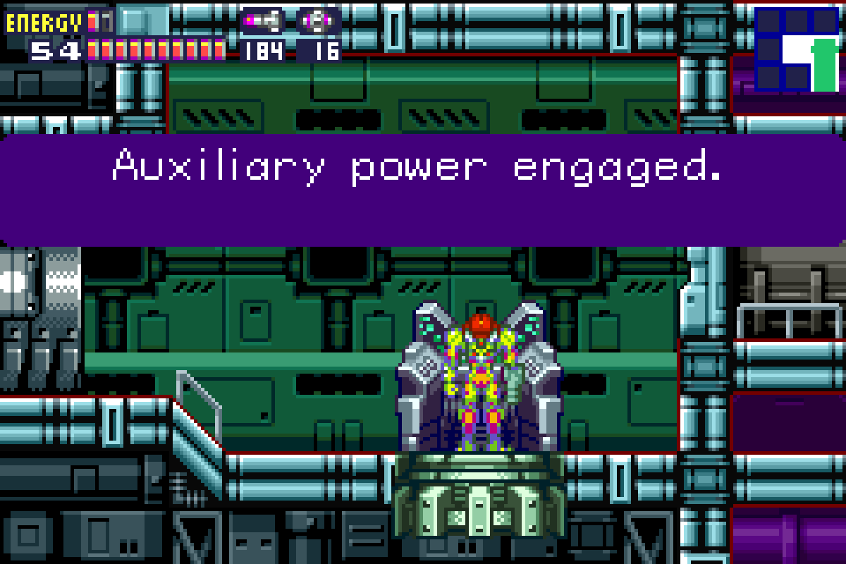 Destroy the Core-X that spawns from Yakuza and acquire the SPACE JUMP. Use the Space Jump to get up to the vent in the ceiling. Restore auxiliary power and step into the Navigation Room to check in with Adam.
