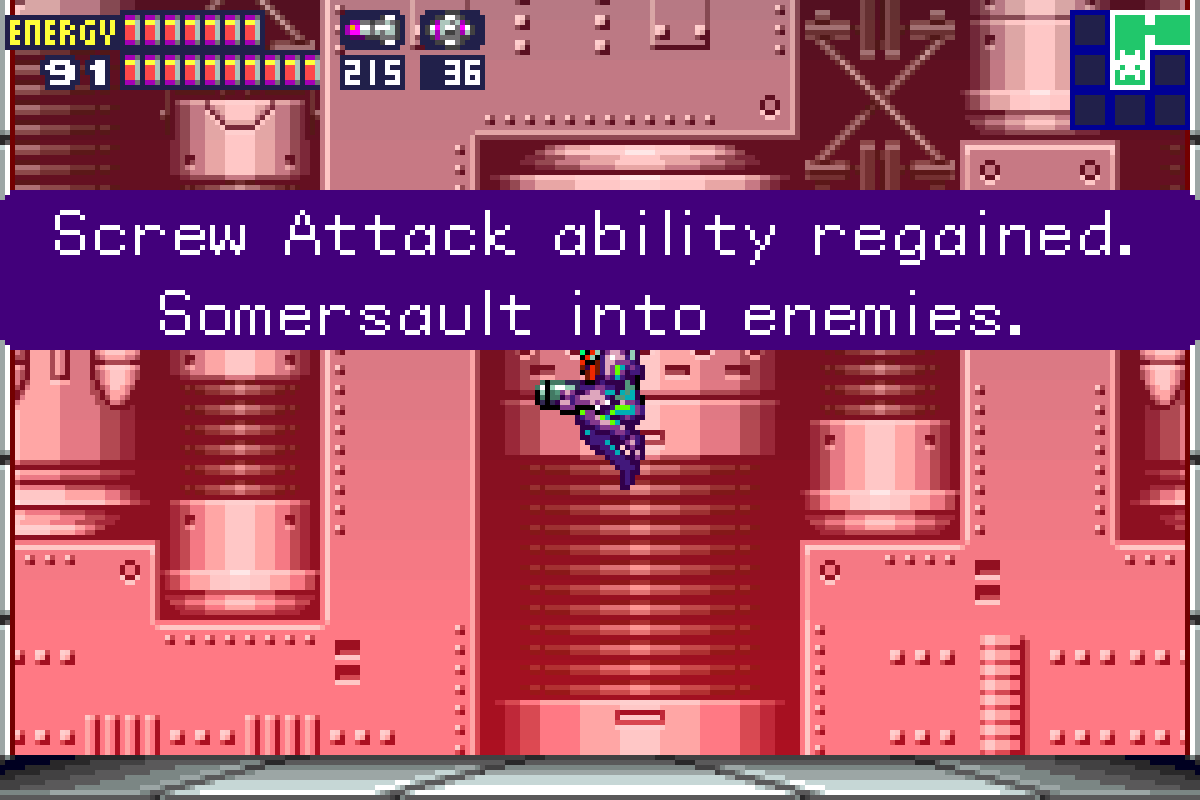 I counted about 24 charged shots before Ridley started self destruction. This battle will be more of a sprint than a marathon, but following these pointers, you should be okay. Deal with the Core-X and we’ll finally have the last powerup of the game, and the ultimate weapon in the Metroid universe: the SCREW ATTACK.