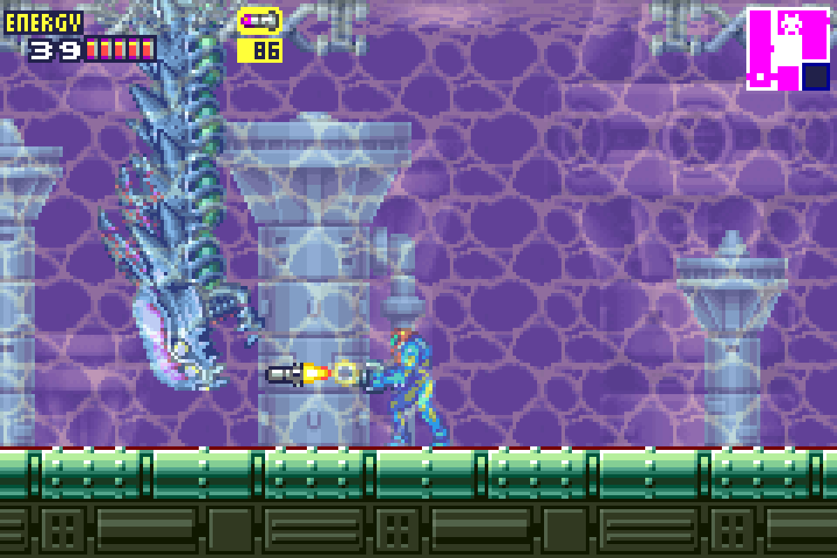 You can sometimes get Yakuza into a pattern where he’ll be bouncing off the wall straight into a Missile shot, then bounce back to the same spot and wall jump right back to your Missile. The more damage Yakuza takes, the faster he moves and the more he will try and land on you. Be moving and always be shooting Missiles upwards. By my count, 11 Missiles to the mouth should be enough to put Yakuza down for the count.