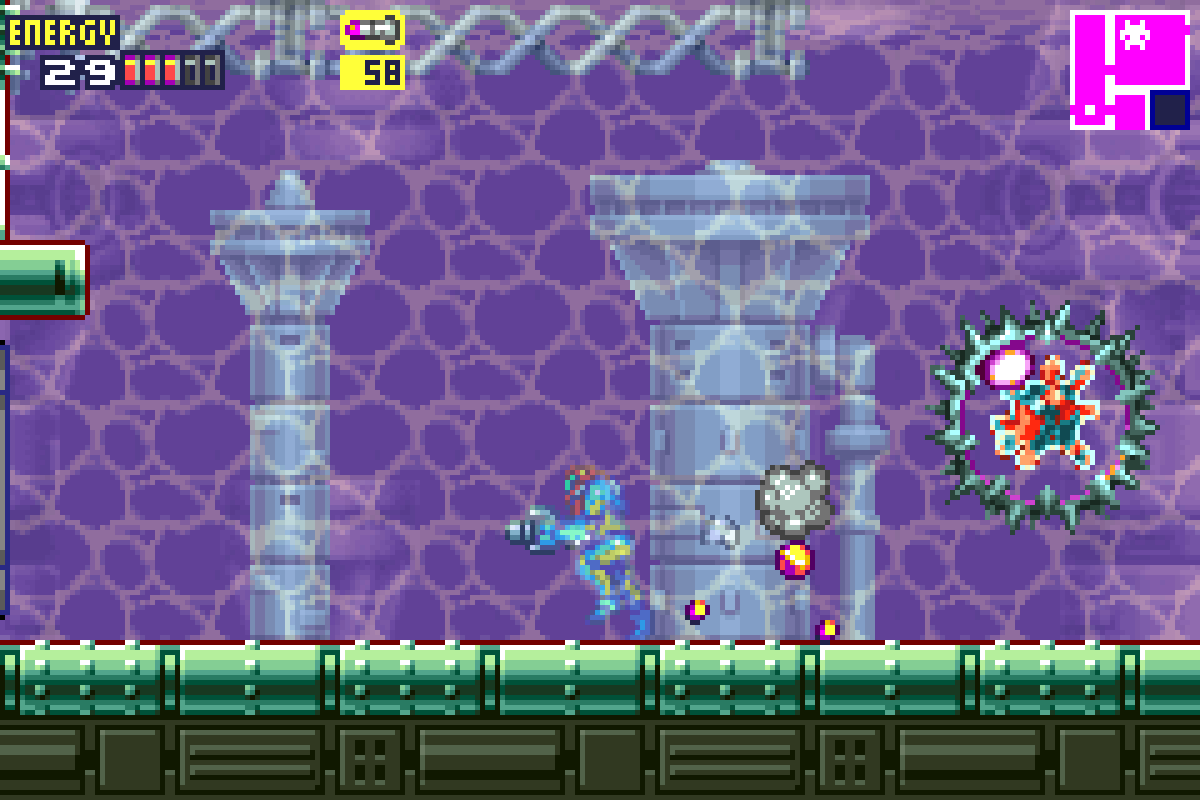 The X will reform a barrier around the core that broke off from Arachnus, and this barrier has spikes and is going to try and ram you. Jump over and dodge the Core-X, blasting it with Missiles to send it flying away from you. There should be some loose X flying around the Core if you’re in need of some Missiles. A couple of shots and this thing will break apart, giving you the MORPH BALL.