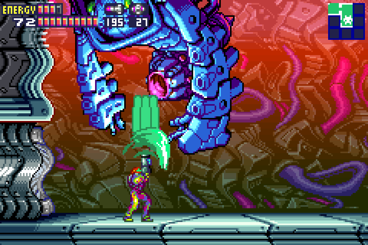 Keep shooting him with Missiles and charged shots, avoid his attacks as best you can, and eventually, Nightmare will fall. Deal with his Core-X and you’ll finally be out of that hideous Varia Suit and into the new GRAVITY SUIT.