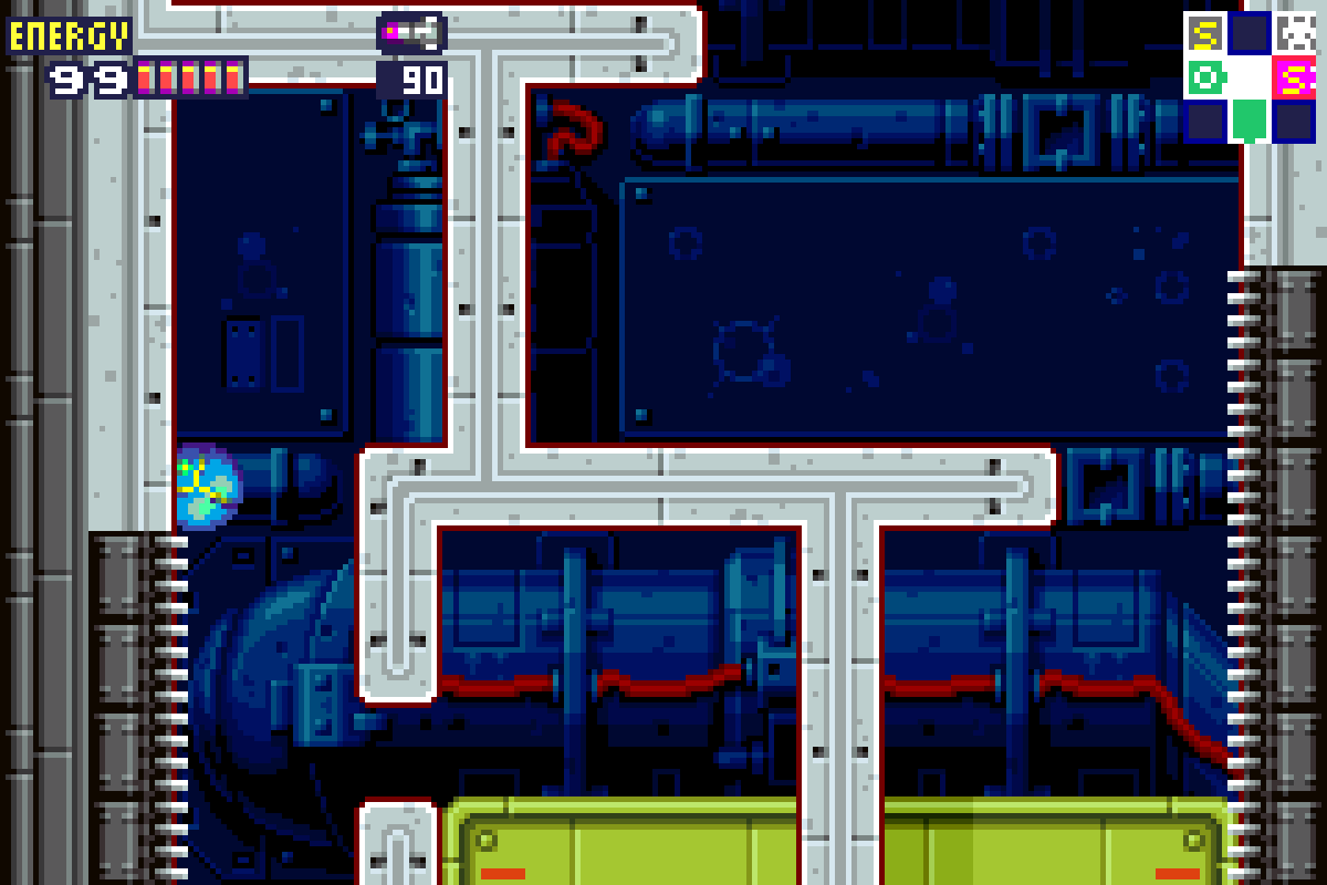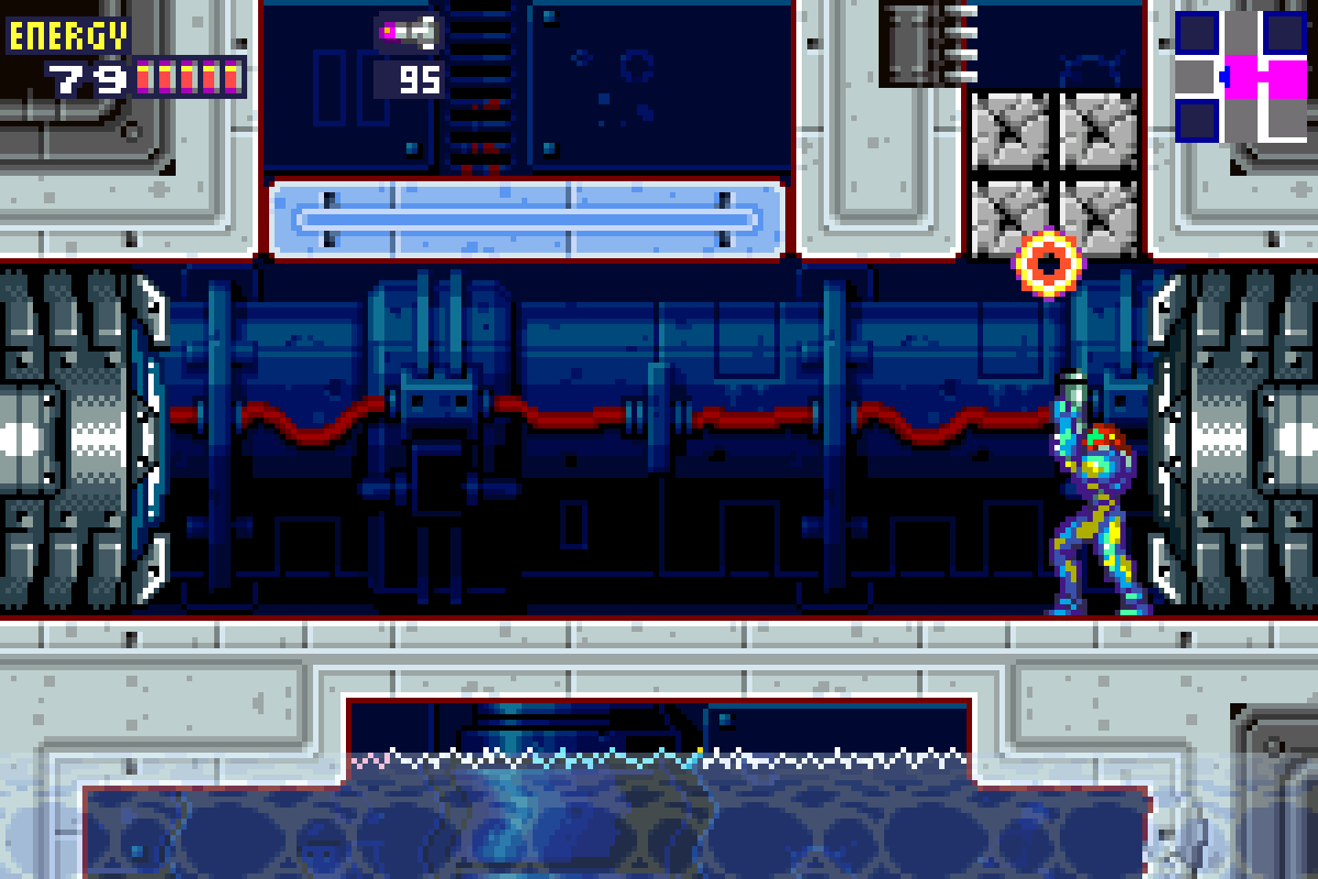 (Side note – one of the annoying things about Metroid Fusion is its relatively unresponsive map. The map would suggest that you can continue on upwards from this point, when obviously the giant crushed platform would suggest otherwise. The game does the same thing when the SA-X destroys a door; the map will show that door as functional even when it is not. Just keep that in mind if ever you’re looking at the map and it seems like the route I’ve suggested is longer than it should be – that’s probably the reason why.)