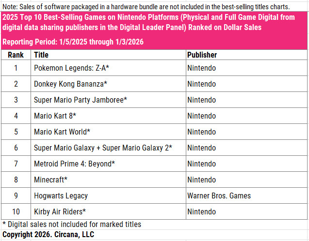 As mentioned above, Circana’s reports exclude digital sales of Nintendo-published games, so this isn’t a complete picture of all games sales. The report also doesn’t include add-on sales (like DLC or in-game currency) or hardware bundles (i.e. a Switch 2 with Mario Kart World included). It’s also worth noting that these lists rank on dollars, not units, sold. Therefore, it’s possible that Minecraft ($30) sold more individual copies than Beyond ($60-70) did in 2025.