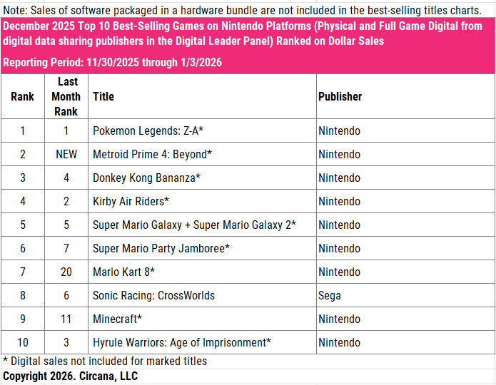 Prime 4 also broke into the U.S. Top 10 Best Selling Games on Nintendo Platforms for December 2025, ranking 2nd above Donkey Kong Bananza and below Pokémon Legends: Z-A. This means Beyond outsold popular family picks like Kirby Air Riders, Super Mario Party Jamboree, and Mario Kart 8 Deluxe during the holiday season. (in physical sales)